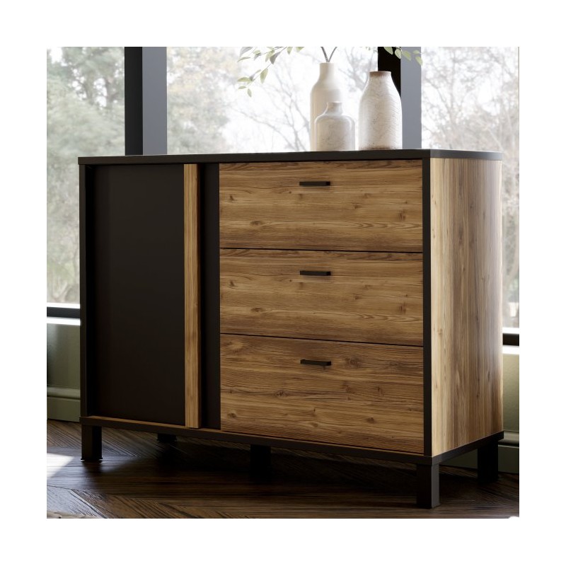 Stonowane barwy ziemi kolekcji HAYATO – dekor Świerk Alpejski w nieco surowej odsłonie i głęboka czerń - tworzą niepowtarzalny kontrast kolorystyczny. Takie zestawienie doskonale odnajdzie się w industrialnym lofcie, wnętrzu urządzonym w duchu japońskiego minimalizmu, a także klasycznej przestrzeni. Meble pozbawione są wymyślnych ozdobników. Jedynie długi pionowy uchwyt biegnący przez całą wysokość frontu jest elementem dekoracyjnym, a przy tym to bardzo praktyczne rozwiązanie, ponieważ możemy go chwycić w dowolnym miejscu. Kolekcja łączy w sobie wszystko, co niezbędne do stworzenia komfortowej strefy dziennej wraz z jadalnią.
